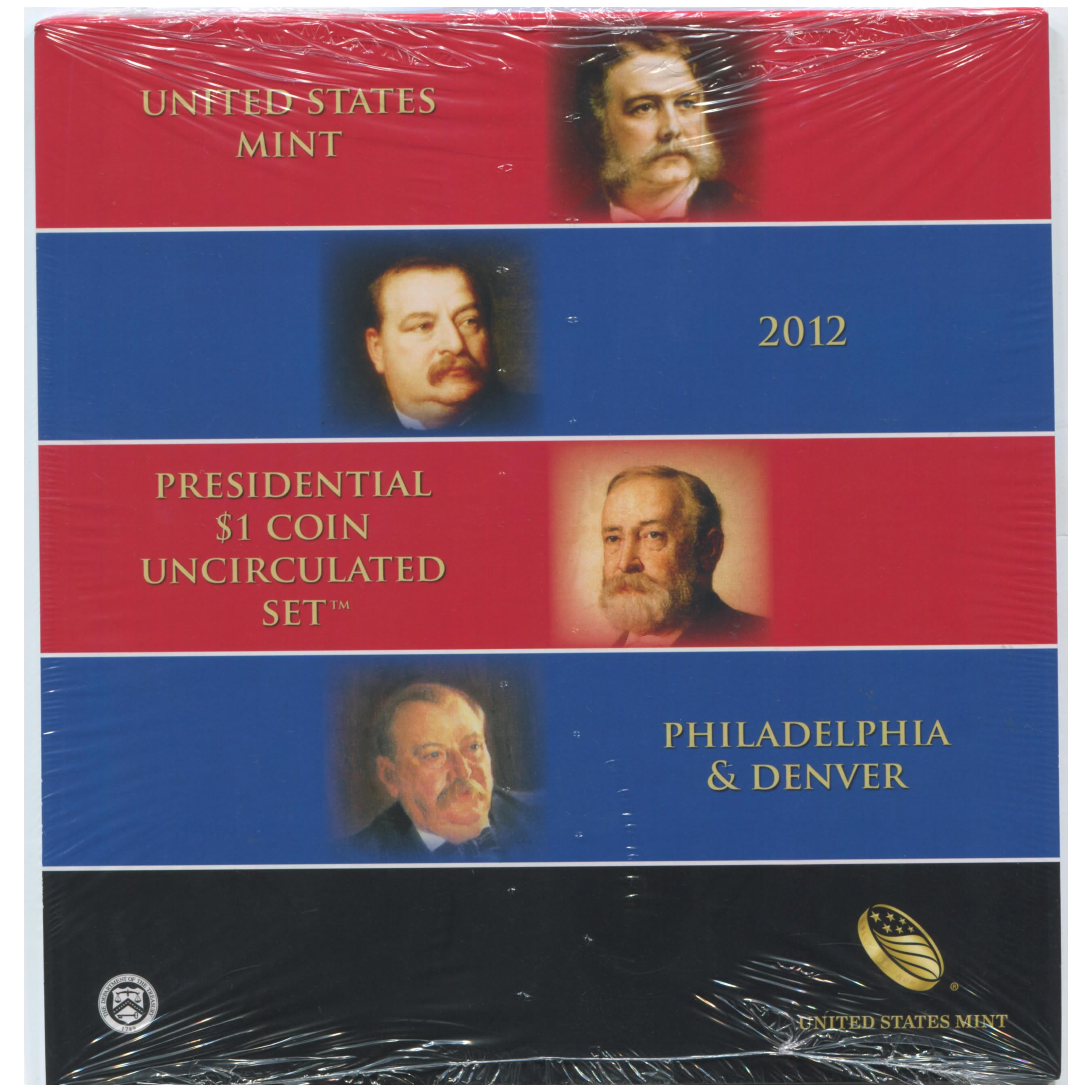 The 2012 Presidential $1 Coin Uncirculated Set contains all of the Presidential Dollar coins issued in 2012. The presidents, on these coins, include Chester Arthur, Grover Cleveland (first term), Benjamin Harrison, and Grover Cleveland (second term). Alongside the four famous presidents, are biographical sketches and portraits, as well as the mint each coin came from. The coins are delicately placed in a folder, the coins' designs easily displayed. The dollars can also be removed from this folder to be placed into collection albums. The obverse, of each coin, displays the past president, along with their name and date of mintage. The reverse features the generic "E Pluribus Unum" saying and the mint-mark, P or D. For size references, the Presidential Dollars are identical in size, weight, and metal content as the Native American $1 coins. The 2012 Presidential $1 Coin Uncirculated Set is now considered a rarity in the coin collecting world and disappears as soon as one enters our inventory.