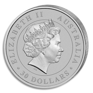 The Australian Koala Kilo Silver 2012 depicts a small koala, snugly clutching a tree trunk. Koalas are built to climb trees so they can access leaves higher than the other animals. Trees and leaves are a koala's main food source so it is vital for them to be able to climb and grip trees without falling. This sweet koala pictured looks like it's about to take a well-deserved nap, after a hearty lunch. One can learn so much about the koala in this picture, including its amazingly craft claws, that spread wide for a perfect grip. Encircling this precious koala are the coin's date of mintage, weight, and purity. There is also a "P" carefully written next to the koala; this is the mint mark of the Perth Mint. The obverse design is a simple side portrait of Queen Elizabeth II. Due to the creative shading on the portrait, the Queen looks more life-like than ever and even has a dimension to her. All of her features are also very detailed, not withholding her maturity in years and her delicate curls. The Queen is accompanied by the coin's place of mintage, and the coin's denomination.