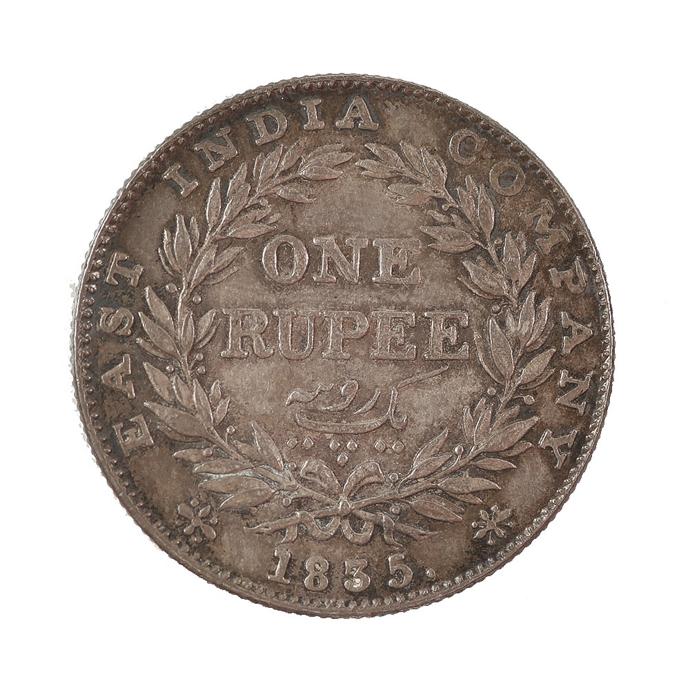 The reverse of the 1835 1 Rupee coin is equally striking, featuring a wreath encircling the denomination "ONE RUPEE" in the center, with the date "1835" inscribed below. Surrounding the wreath is the inscription "EAST INDIA COMPANY," signifying the issuing authority. The reverse design is simple yet elegant, with the wreath’s intricate detailing showcasing the skill of the mint engravers. The design was intended to be clear and functional, emphasizing the denomination and issuing authority without unnecessary embellishment. In AU condition, the reverse design remains crisp, with only slight wear visible on the highest points of the wreath, and the legends are still sharp and fully legible. The coin’s silver composition and overall condition enhance its appeal, making it a desirable example of British colonial coinage.