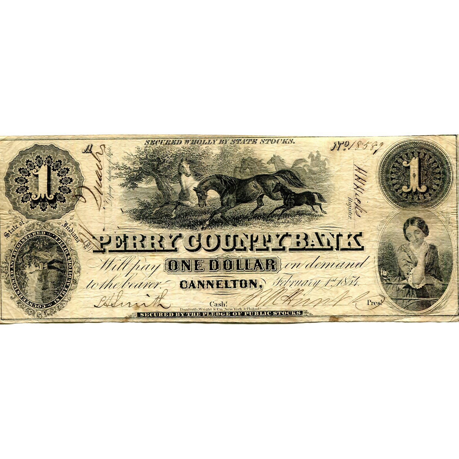 The mintage of the 1854 $1 Perry County Bank note is difficult to determine with precision, as records from smaller banks during the 19th century are often incomplete or non-existent. However, it is widely believed that only a limited number of these notes were printed, making surviving examples highly sought after by collectors. Notes from smaller, state-chartered banks like Perry County Bank were typically issued in smaller quantities compared to those from larger, more prominent financial institutions, and many of these notes were destroyed either through natural wear or in the process of being redeemed. As a result, the 1854 $1 Perry County Bank note remains a rare item, especially in good condition. The rarity of surviving notes, combined with the historical context and the detailed design, has made this note highly collectible among numismatists and those interested in early American banking history.