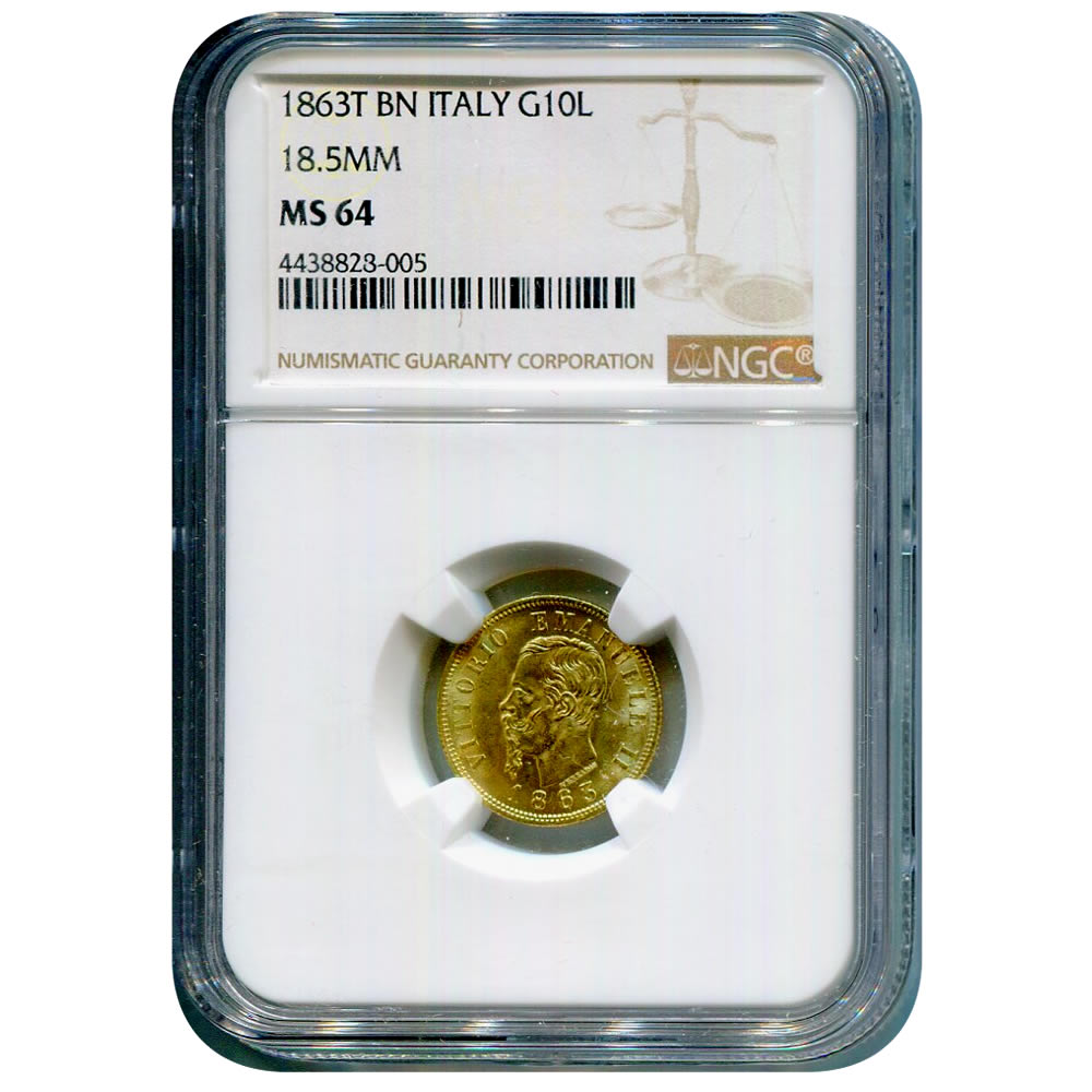 Italy 10 Lire Gold 1863 T BN 18.5mm MS64 NGC