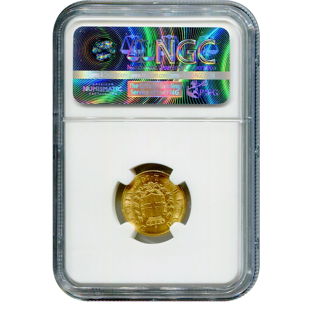The condition of the 1863 10 Lire coin is a critical factor in determining its value. The example in question, graded MS64 by NGC, is in exceptional condition for a coin of its age. An MS64 grade indicates that the coin has only minor imperfections and retains much of its original luster. These coins, particularly those from the mid-19th century, are often subject to wear and tear, so coins in high grades like MS64 are prized among collectors. The high grade of this coin means that it exhibits sharp details in the design, with only light wear visible on the high points of the coin. The fine details of the king's portrait and the laurel wreath on the reverse are clearly visible, making it an excellent example of this historic issue.
