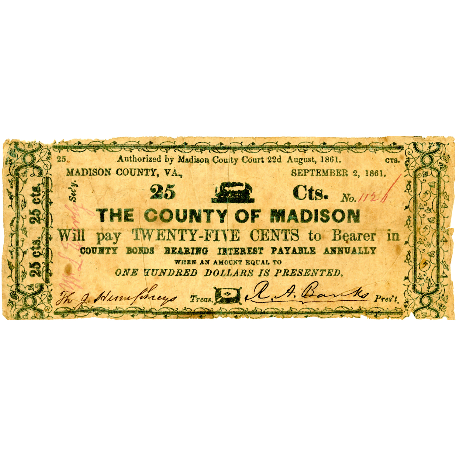 Virginia Madison County 25 Cents 1861 Interest Bearing Note VG